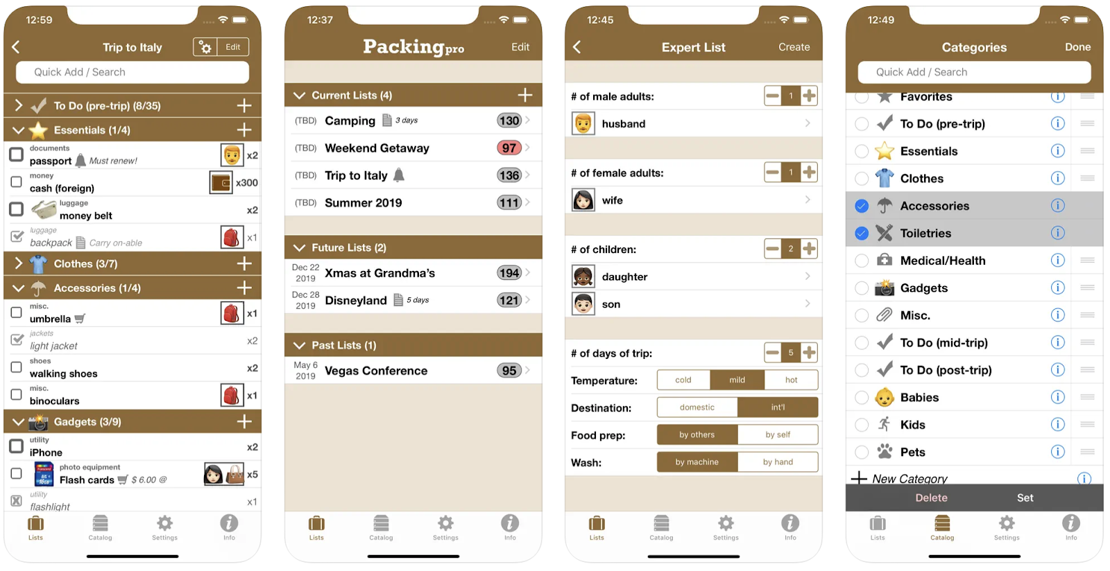 You can add things to your packing list from a catalog of over 800 items, ensuring everything you need to pack can be added to your list. You can also create lists for multiple travelers, including families.